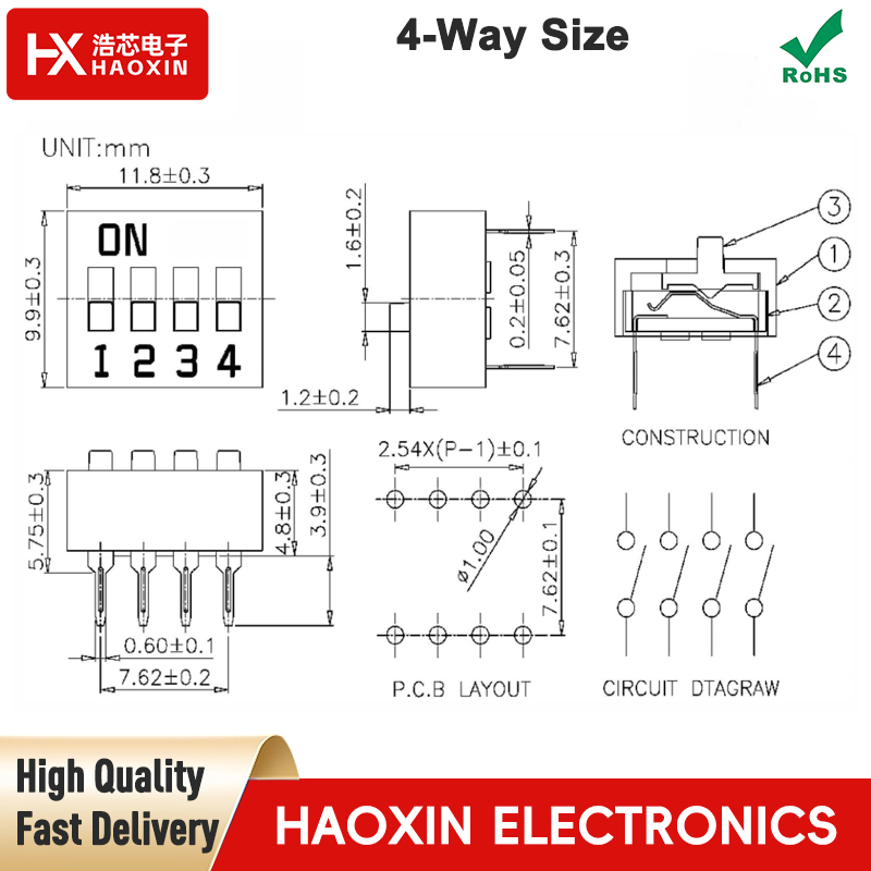 The 4-way red SPST standary slide sype dip switches pitch is 2.54mm. It features 8 pins made of 0.2mm thick copper alloy with a 0.8μm gold plating. The housing is constructed from high-temperature-resistant plastic and meets environmental protection requirements.