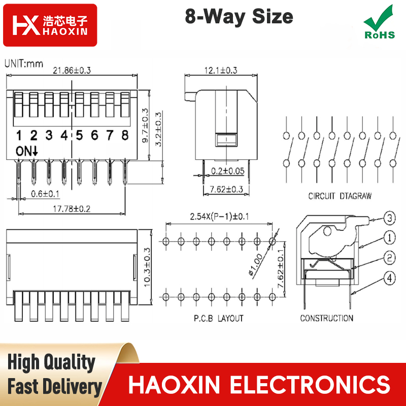 The 8-way SPST standary piano type dip switches pitch is 2.54mm. It features 16 pins made of 0.2mm thick copper alloy with a 0.8μm gold plating. The housing is constructed from high-temperature-resistant plastic and meets environmental protection requirements.