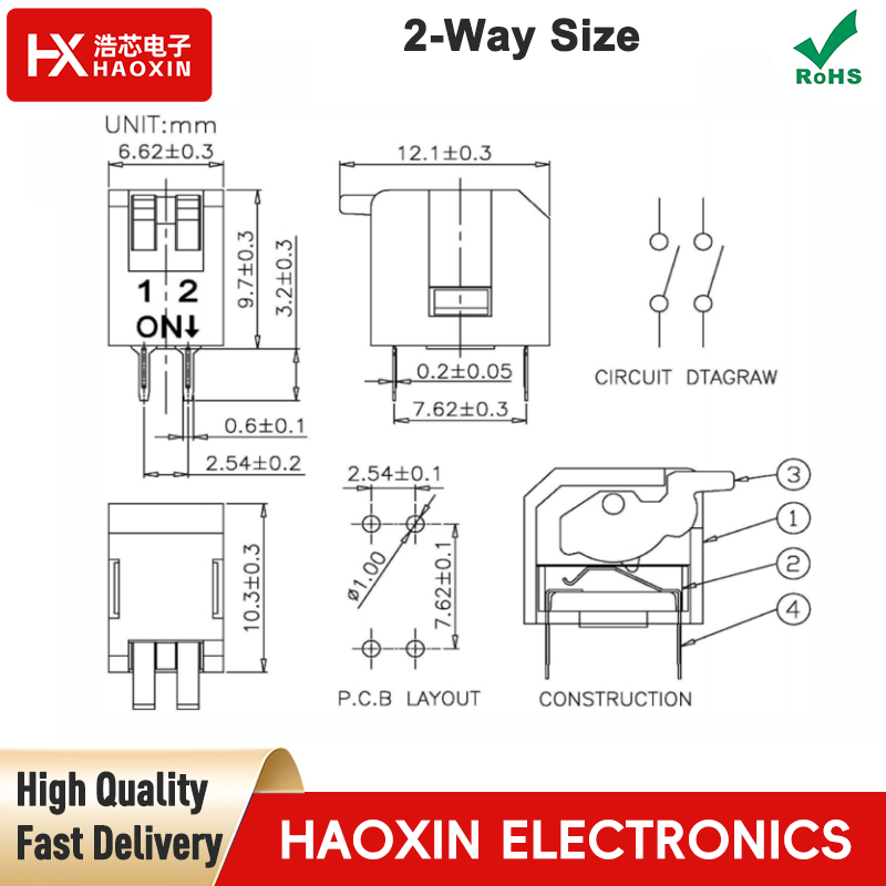The 2-way red SPST standary piano type dip switches pitch is 2.54mm. It features 4 pins made of 0.2mm thick copper alloy with a 0.8μm gold plating. The housing is constructed from high-temperature-resistant plastic and meets environmental protection requirements.