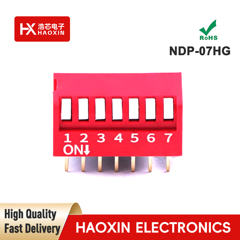 The 7-way red SPST standary piano type dip switches pitch is 2.54mm. It features 14 pins made of 0.2mm thick copper alloy with a 0.8μm gold plating. The housing is constructed from high-temperature-resistant plastic and meets environmental protection requirements.