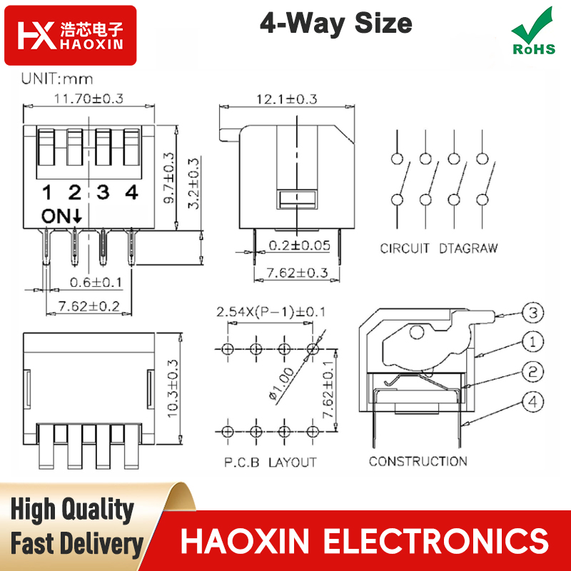 The 4-way blue SPST standary piano type dip switches pitch is 2.54mm. It features 8 pins made of 0.2mm thick copper alloy with a 0.8μm gold plating. The housing is constructed from high-temperature-resistant plastic and meets environmental protection requirements.