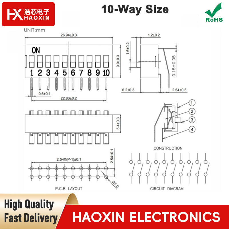 Application Scenarios:The 2.54mm 10-way black SPST standary right angle type DIP switches are widely used for parameter configuration and function selection in electronic devices, such as PLCs in industrial control, parameter adjustment in instruments and meters, feature configuration in smart home devices, and mode switching in security systems and communication equipment. They offer convenient operation without requiring complex programming.