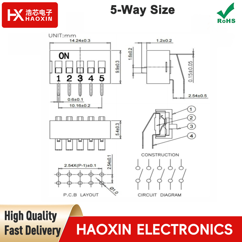 Application Scenarios:The 2.54mm 5-way SPST standary right angle type DIP switches are widely used for parameter configuration and function selection in electronic devices, such as PLCs in industrial control, parameter adjustment in instruments and meters, feature configuration in smart home devices, and mode switching in security systems and communication equipment. They offer convenient operation without requiring complex programming.